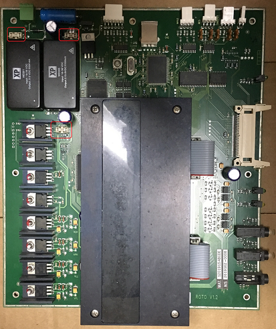 8. If you are onsite, you may check the fuses of the sensor board (3 small fuses seen below). If fuses are ok, a Villa representative may suggest you connect a new N2 Signal Cable n. 6208532000 (harness running through arm to the sensor board).