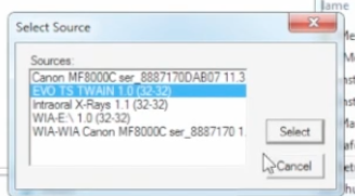 3. Select the correct source, EVO TS, for in the third party software twain source settings.